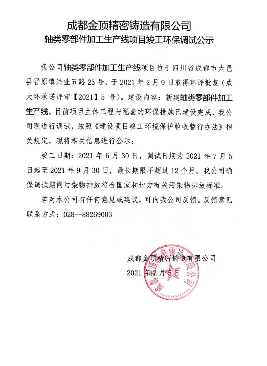 成都金頂精密鑄造有限公司軸類零部件加工生產線項目竣工環保調試公示